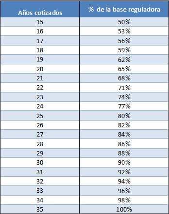 El resumen es que con 15 años cotizados sólo tendrás derecho a cobrar el 50% de la base reguladora en cualquier caso y conforme cotices más años podrás cobrar más hasta alcanzar el 100% a los 37 años. Eso sí, cobrar el 100% de la base reguladora no quiere decir que tu pensión sea equiparable a tu sueldo antes de jubilarte.