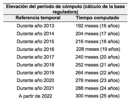 Entre los cambios que introduce la reforma de las pensiones está también un aumento progresivo de la base reguladora a partir de 2013, de forma que en 2022 se computen 25 años como base reguladora. La progresión será la siguiente