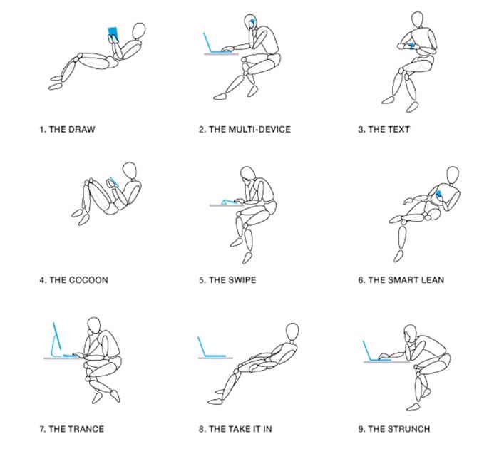 Este informe se han determinado nueve posturas habituales, entre las cuales como veremos hay algunas mucho más dominantes que otras, y también, hay diferencias en función de los dispositivos que estamos usando, e incluso diferencias de género ya que las mujeres adoptan posturas diferentes en sus preferencias a la hora de trabajar en relación a los hombres.