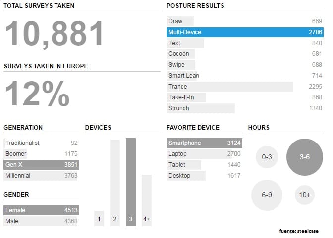 Un informe elaborado por SteelCase sobre las posturas que adoptamos en el trabajo, fundamentalmente en nuestra relación con los dispositivos de trabajo incluyendo las nuevas tecnologías, nos ofrece algunas sorpresas al respecto.